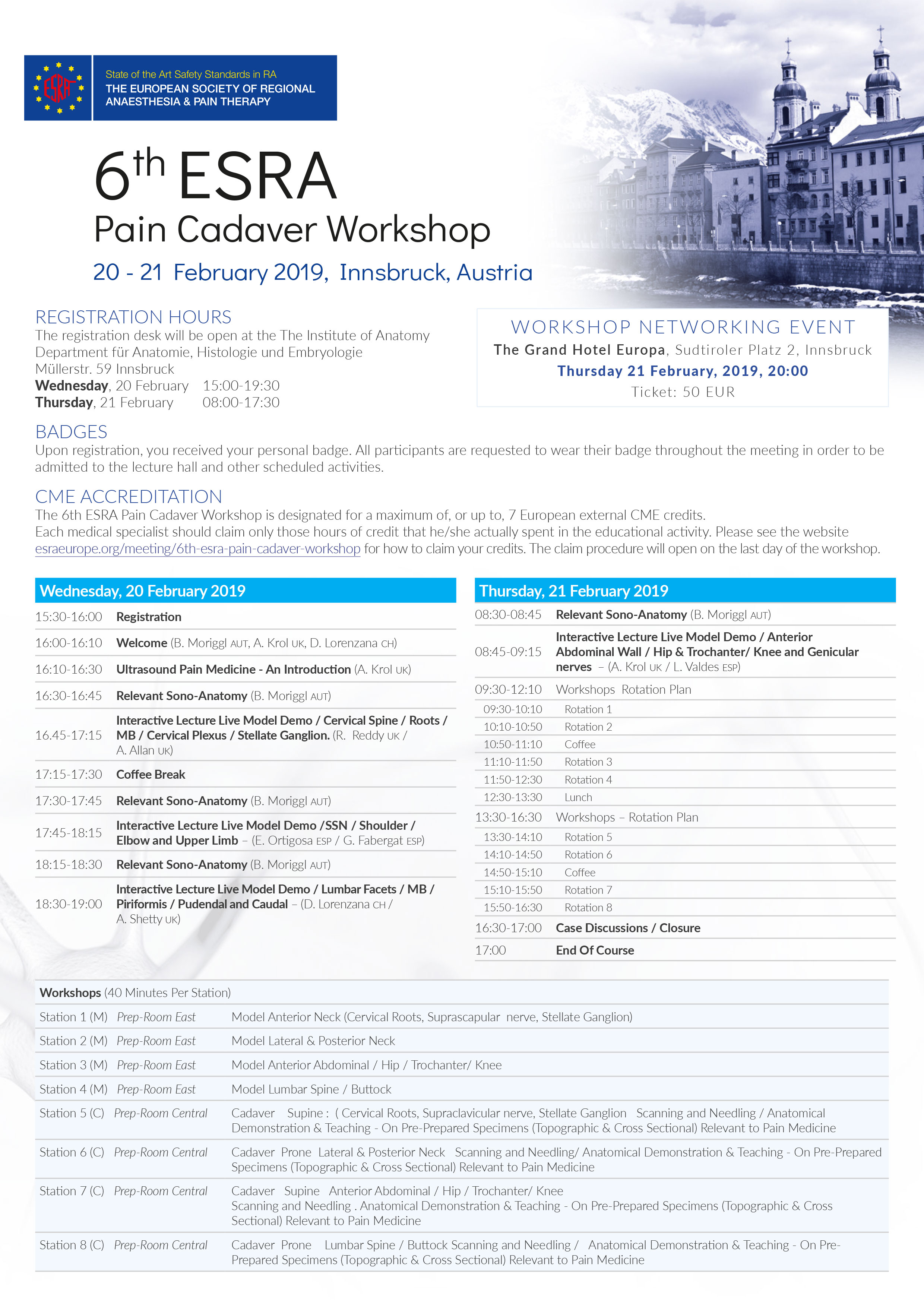 This is a two-days intensive hands-on cadaver workshop offered to physicians to improve their skills in chronic block procedures. After expert lectures the workshop is focused on hands-on practice on models and fresh frozen human cadavers. Participants will acquire a sound knowledge of ultrasound imaging and needling techniques (on cadavers) for interventional pain management techniques.